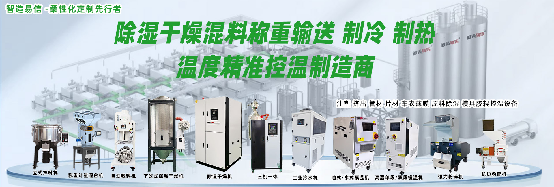 我们专业生产销售冷水机、模温机、除湿干燥机、粉碎机、拌料机、上料机等,提供塑胶成型辅助设备系统化对策。现为多家出口企业代工,专业的生产及销售成本控制,为您提供强有力的市场竞争支持,让您没有后顾之忧!